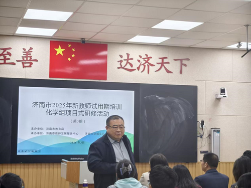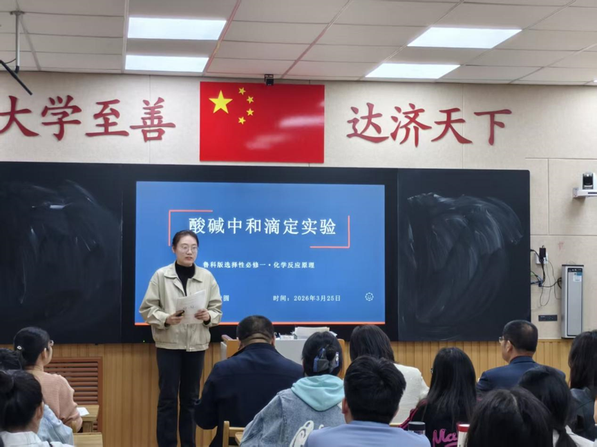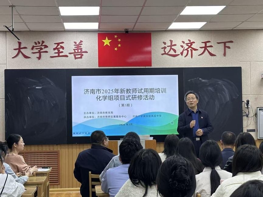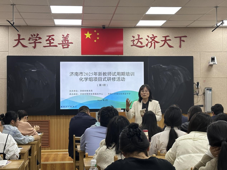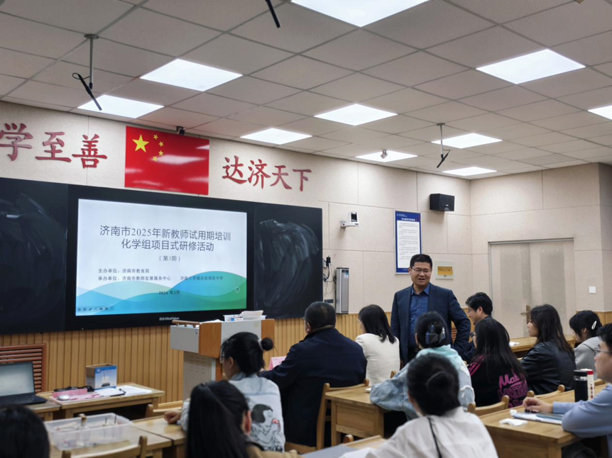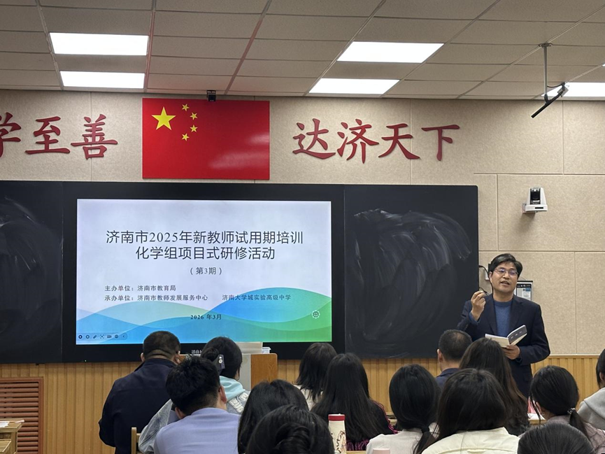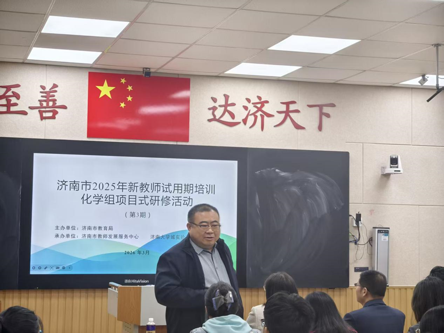 为助力新教师快速提升专业素养与教学实践能力,搭建化学学科教学交流研讨的优质平台,推动济南市高中化学教育教学高质量发展,2026年3月25日下午,2025年济南市新教师试用期培训项目式研修活动在我校顺利举行。市级导师团队成员山东省实验中学李辉及山东师范大学附属中学杜明成、山东师范大学化学院教授姜言霞、济南市新入职化学教师、我校校长张家鹏、副校长冯玉及化学组全体教师参与活动。活动由市级导师曹慧主持。