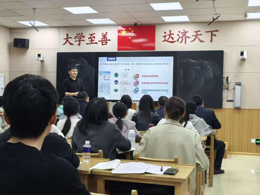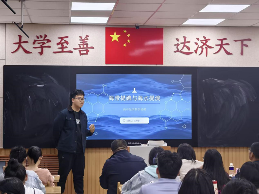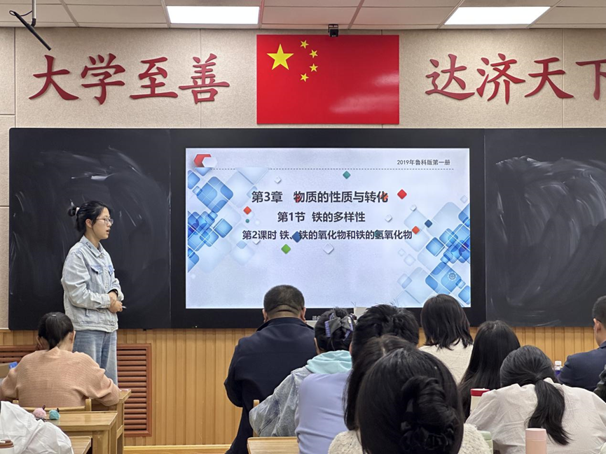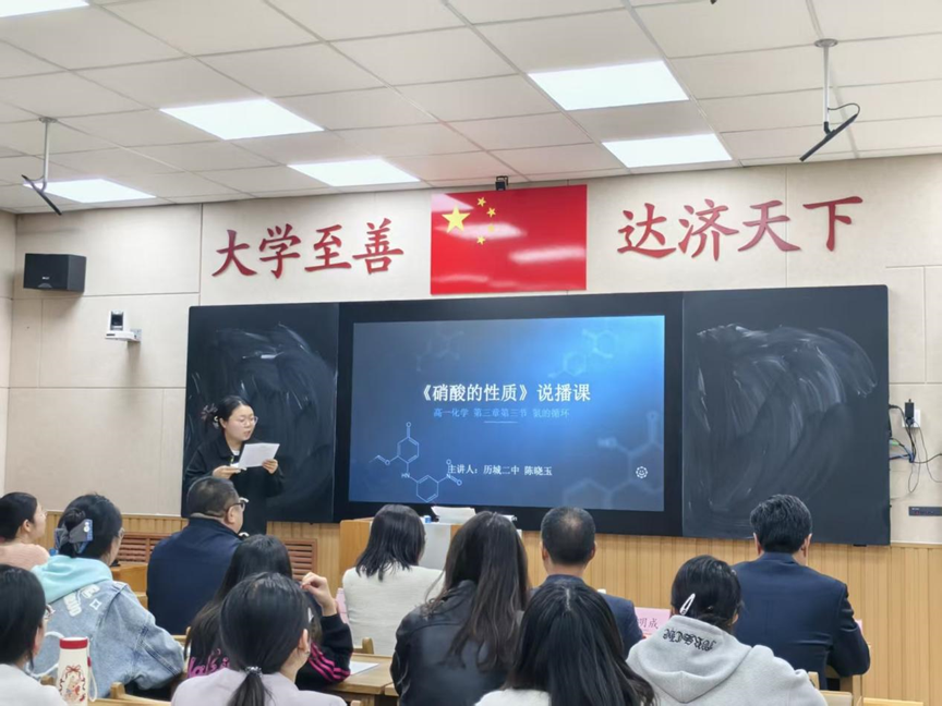 随后,本次活动采用自主报名与随机抽签方式,六位新教师依次进行说播课展示:济南大学城实验高级中学倪晓龙带来了《化学反应的快慢》一课的精彩说播课展示,紧扣高中化学必修阶段核心知识点,展现了扎实的教学功底;山东省实验中学裴梦圆以《酸碱中和滴定》为主题开展说播,聚焦高中化学实验核心考点,详细讲解了滴定实验的原理、实验仪器的选择与使用规范;历城第二中学陈晓玉聚焦《硝酸的性质》,紧扣氮及其化合物的知识脉络,通过说播课的形式,系统梳理了本节课的教学目标、课堂环节与重难点突破方法;历城第一中学王传宇围绕《海带提碘与海水提溴》,在说播中深度融入学科实践理念,详细阐述了课程设计思路,从海水资源的利用切入,拆解海带提碘、海水提溴的完整实验流程;济南中学郭连峰针对《铁盐与亚铁盐》一课进行说播展示,立足新课标对学科核心素养的要求,逻辑清晰地讲解了教学设计思路与学情适配策略;济南第七中学黄禛则以《铁、铁的氧化物和铁的氢氧化物》为核心,在说播中注重引导学生构建物质分类观、元素价态观,结合实验演示和生活实例突破教学难点,同时反思了教学中如何更好地衔接前后知识,展现了严谨的教学态度。