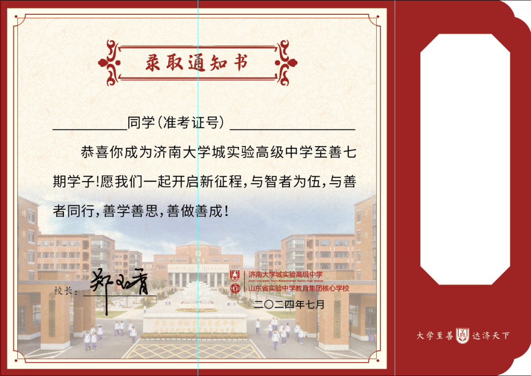 祝贺你成为济南大学城实验高级中学(山东省实验中学教育集团核心学校)的至善七期学子!在这里,你将点燃新的希望,开启新的征程,拥有新的收获,成为更好的自己,“大学至善,达济天下”!请持准考证或者身份证,到校报到,具体安排如下: