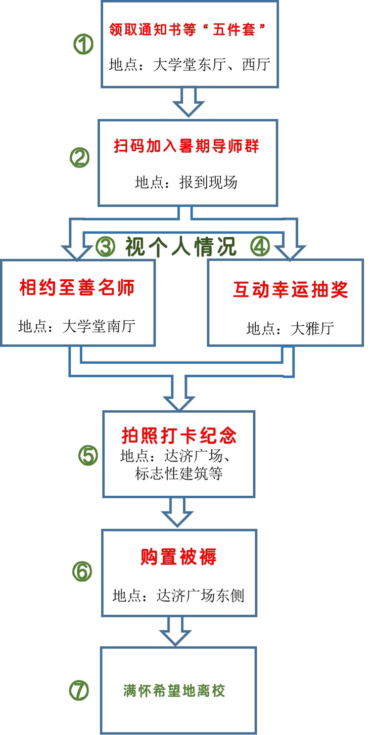 1.7月24日早8:30起按照公示的序号、错时到济南大学城实验高级中学报到,学生到达后按照引导有序排队入校,家长可陪同入校购买床上用品等。学生按照引导到大学堂一层东厅、西厅领取录取通知书和学习材料等。