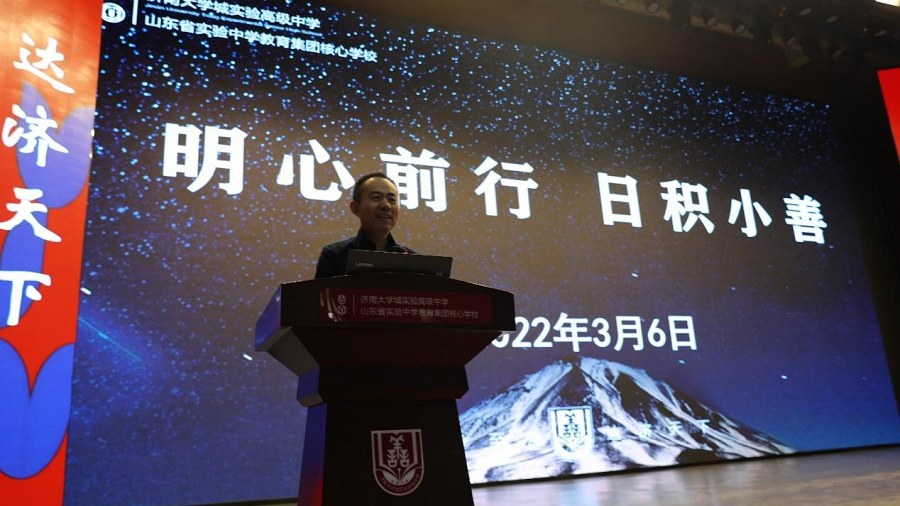 张新府以“明心前行,日积小善”为题发出了动员令。他向至善学子提出四方面要求,希望全体学子共行共勉:对照明心,勿忘品学兼优的模样,希望学子们铭记历经中考洗礼脱颖而出的自己,把优秀当做一种习惯;珍惜时间,勿忘似水流年的无情,希望学子们珍惜时间,重视课前三分钟、自习结束前5分钟、晚休的宝贵时光,自律自强自省;相互携手,勿忘水涨船高的寓意,希望全体同学能够相互携手共同营造安静的学习生活环境,做到眼中有他人,心中有集体,共同进步;日积小善,勿忘水滴石穿的道理,希望全体同学能够日积小善,践行水滴石穿的守望。最后张新府向同学们展示了“日积小善,止于至善”微专题促提升活动的实施过程,望同学们相互监督,时刻规范言行,共同续写大学城实验高中的辉煌。