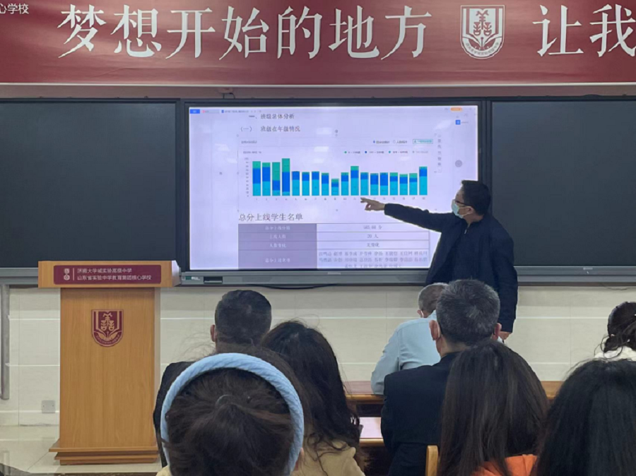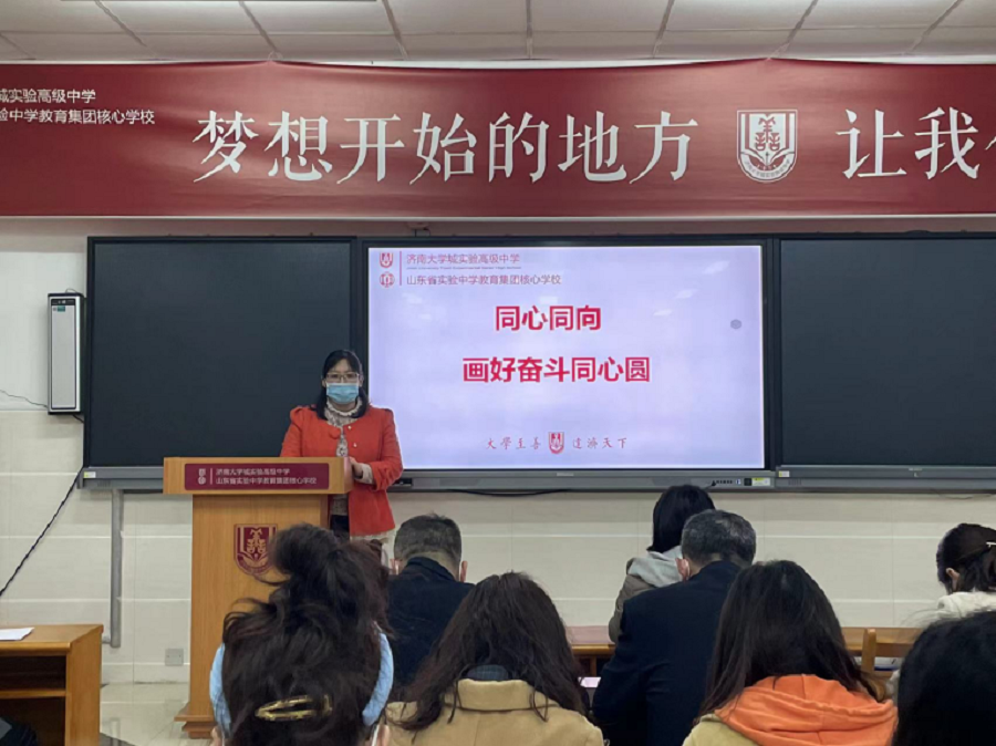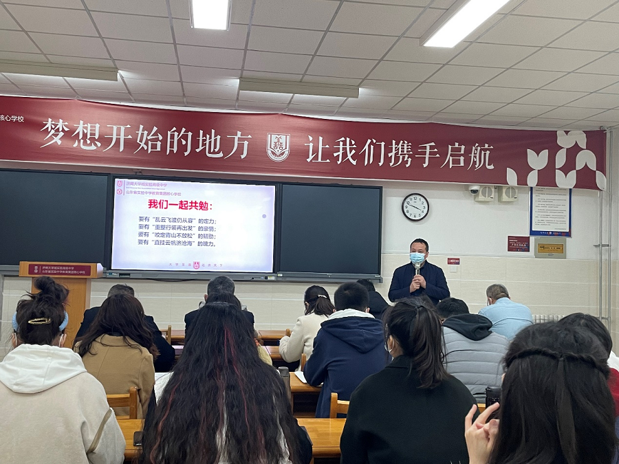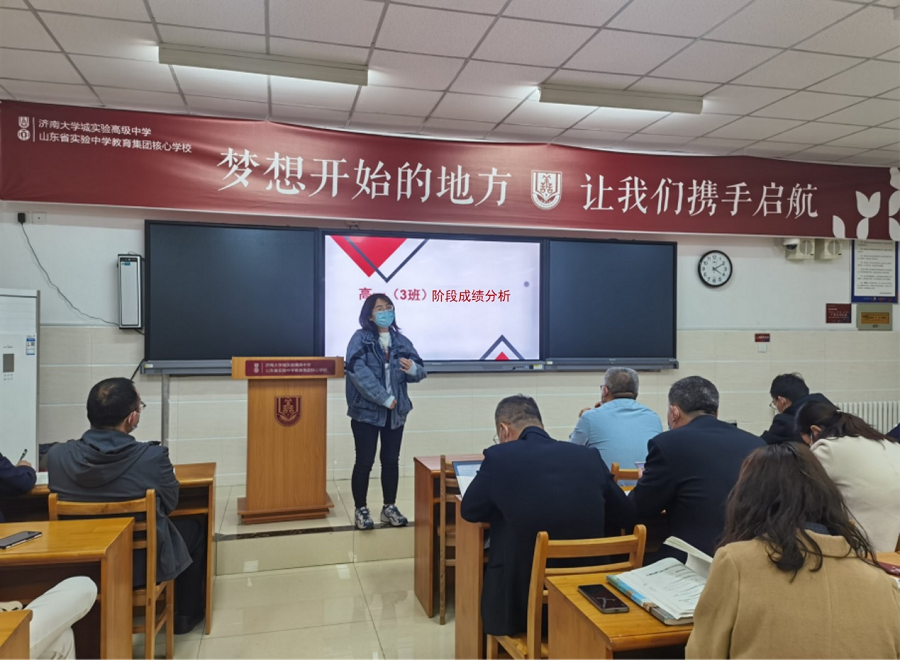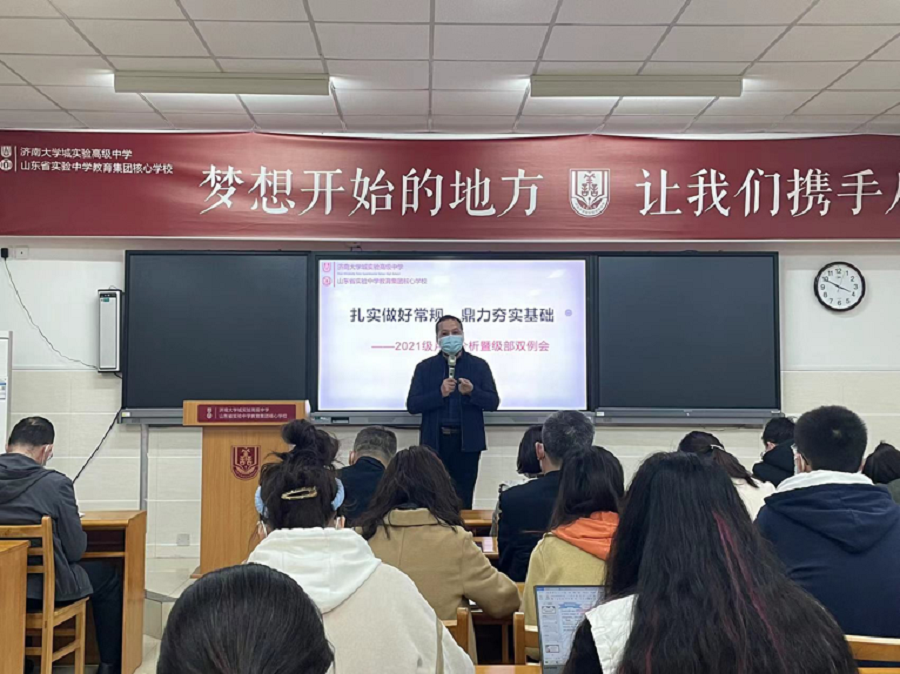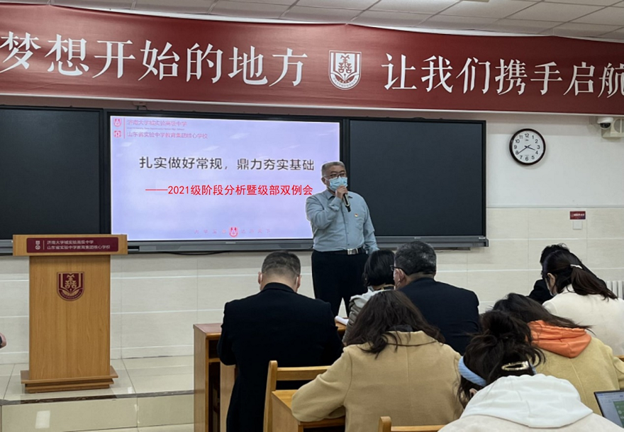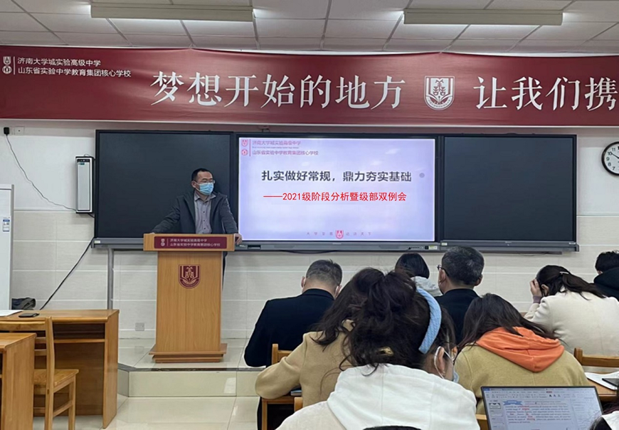 3月29日,济南大学城实验高中2021级全体教师在守正厅召开以“扎实做好常规,鼎力夯实基础”为主题的阶段检测分析暨至善治理专题级部双例会。专题学术支撑年级治理,是正努力探索一条有效方式。年级主任徐成周主持会议,备课组长、班主任代表作了典型发言,分管年级副校长刘威、教学部主任康辉、年级主任吕全心参加。