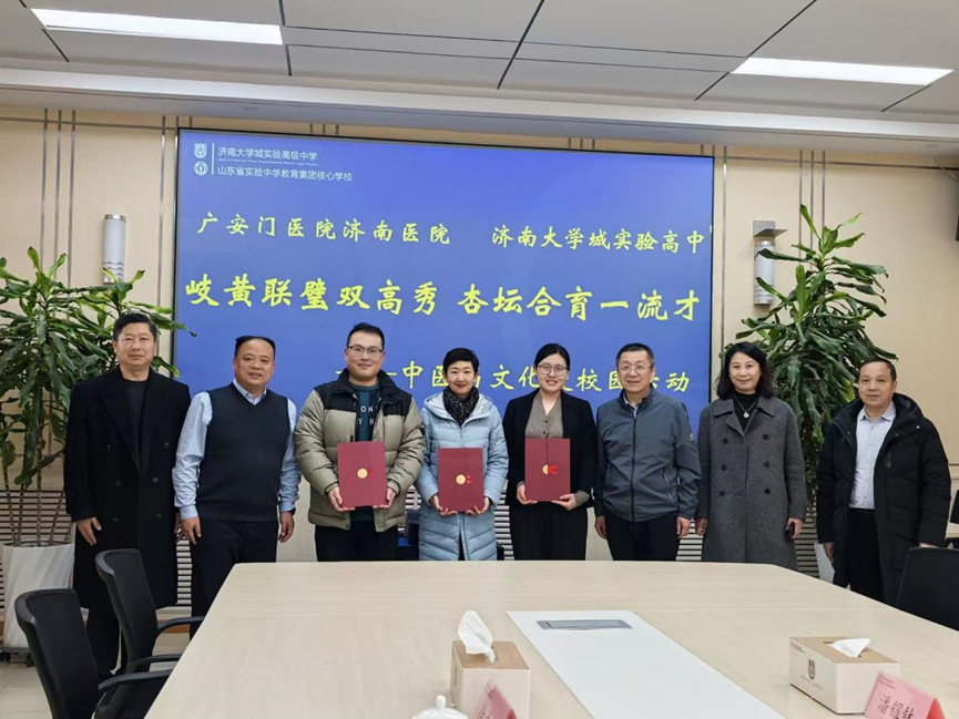 广安门医院济南医院党委书记张若维、专职党委副书记陈嫚嫚、党办副主任兼团委副书记王瑞雯,以及针灸一科副主任医师马琳、高血压病科住院医师潘耀钵等一行人,与济南大学城实验高中校长张家鹏、副校长赵百杰、冯玉等校领导及相关部门负责人齐聚一堂,共同见证了这一文化盛事。
