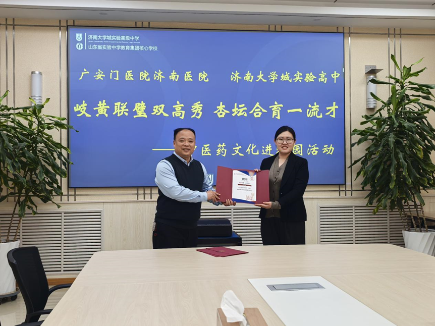 随后,济南大学城实验高中为广安门医院济南医院的专家团队颁发聘书,聘请王瑞雯、马琳、潘耀钵等医师担任学校中医药文化校外指导老师,此举将为学校中医药文化课程建设、实践活动开展提供专业的师资支持与技术指导。