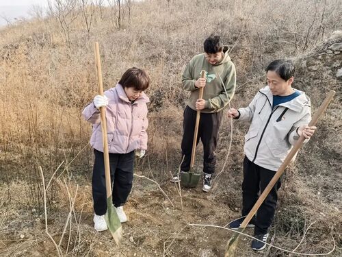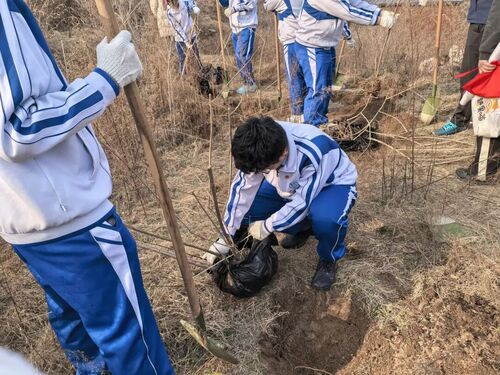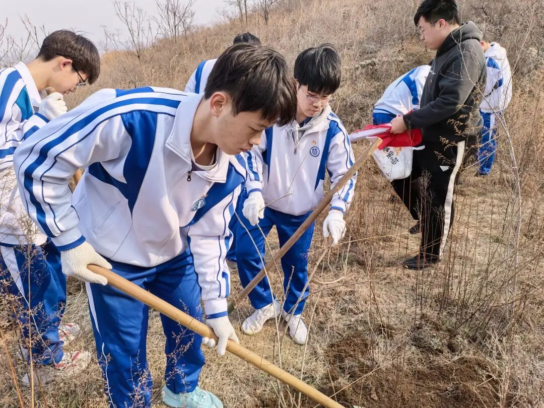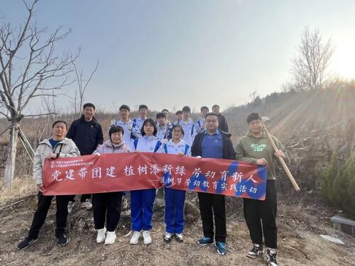 3月10日,济南大学城实验高级中学举行“植绿护绿践初心,劳动筑梦向未来”植树节主题劳动实践活动,团员学生代表和党员教师代表来到五峰山双立实习基地种下绿色和希望。