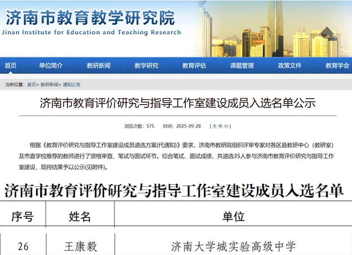 近日,济南市教育教学研究院公布了“教育评价研究与指导工作室”首批成员遴选结果,我校教师王康毅凭借扎实的专业素养,经过笔试、面试等环节成功入选,成为全市仅35位入选教师中的一员。