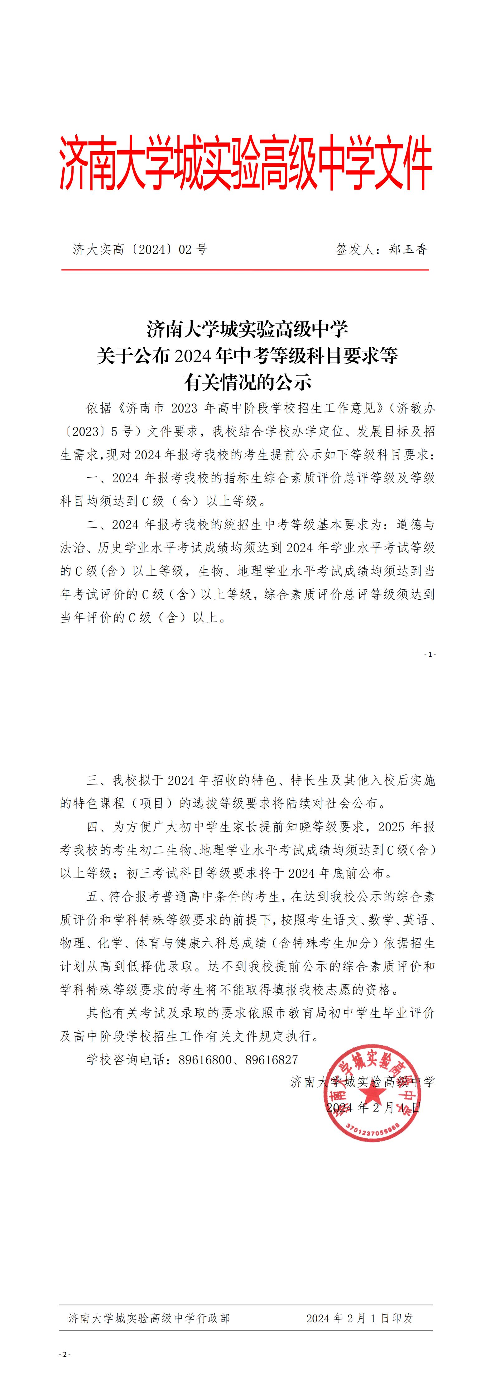 济南大学城实验高级中学关于公布2024年中考等级科目要求等有关情况的公示