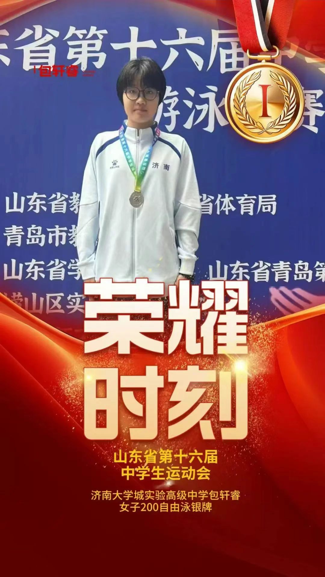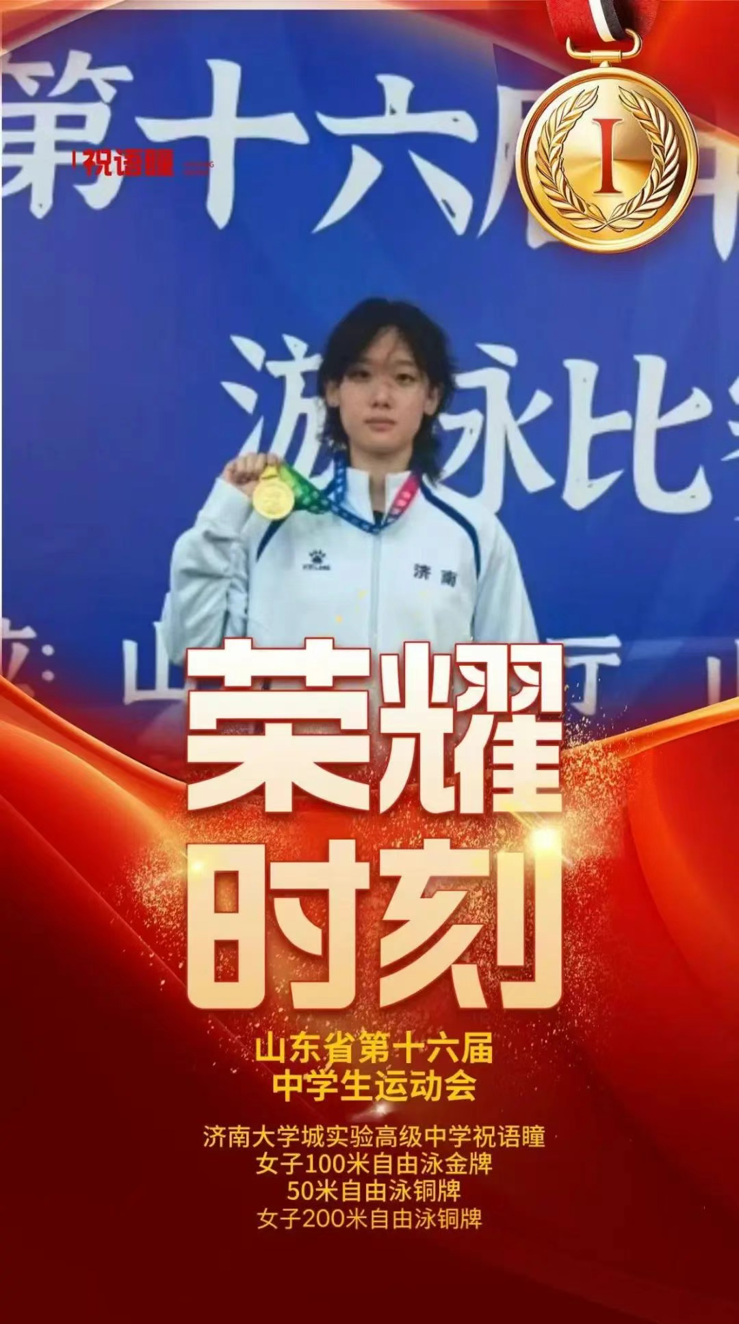 本次征程的高光时刻由祝语瞳同学点燃——她在女子100米自由泳项目中技压群芳,一举摘得金牌,这枚沉甸甸的奖牌不仅是她个人的突破,更是本届赛事济南代表队的首枚金牌!祝语瞳还展现出全面实力,同时将女子50米自由泳和200米自由泳两枚铜牌收入囊中。