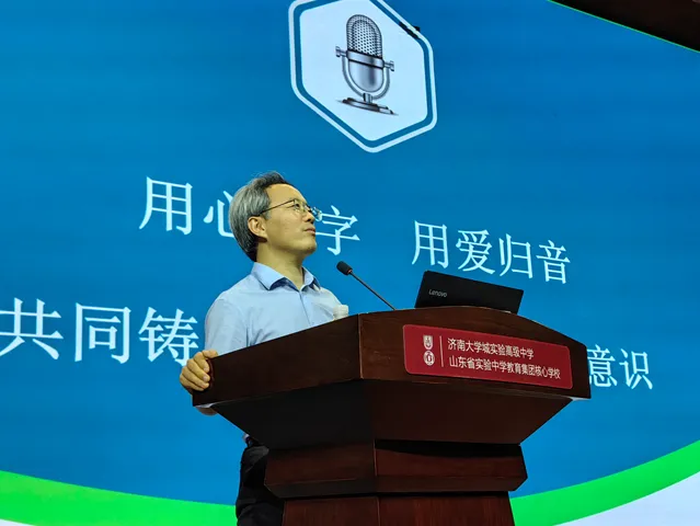 为贯彻国家语言文字工作方针,弘扬中华优秀传统文化,济南大学城实验高级中学以“加大国家通用语言文字推广力度,促进铸牢中华民族共同体意识”为主题,开展第28届全国推广普通话宣传周系列活动,助力师生提升语言文字应用能力,增强民族自豪感与文化自信心。9月16日晚,我校邀请山东艺术学院戏剧学院播音与主持系主任李克振副教授带来“用心吐字 用爱归音”专题讲座,讲座由副校长冯玉主持。