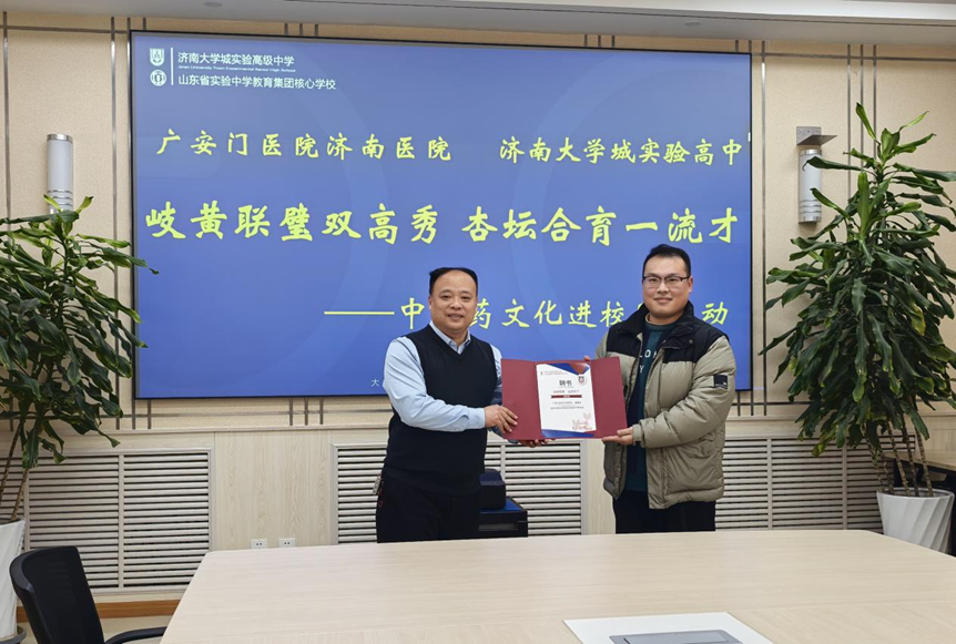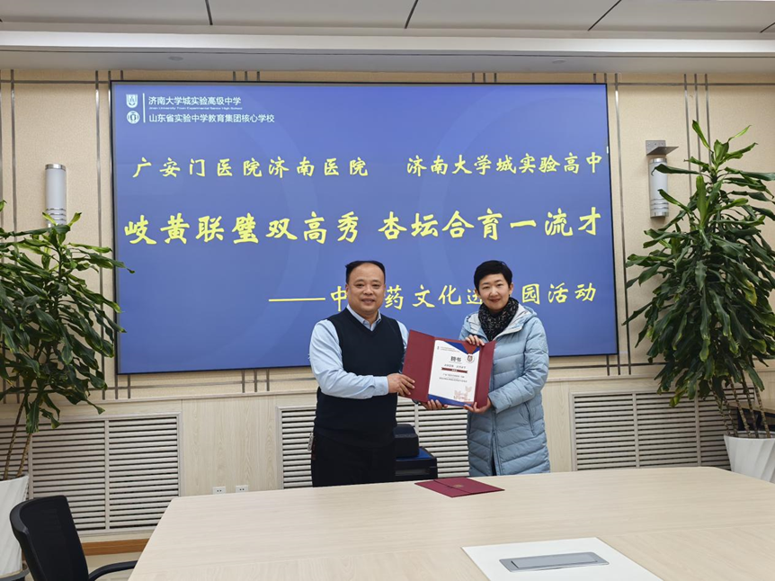 随后,济南大学城实验高中为广安门医院济南医院的专家团队颁发聘书,聘请王瑞雯、马琳、潘耀钵等医师担任学校中医药文化校外指导老师,此举将为学校中医药文化课程建设、实践活动开展提供专业的师资支持与技术指导。