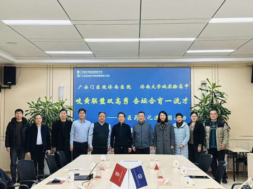 广安门医院济南医院党委书记张若维、专职党委副书记陈嫚嫚、党办副主任兼团委副书记王瑞雯,以及针灸一科副主任医师马琳、高血压病科住院医师潘耀钵等一行人,与济南大学城实验高中校长张家鹏、副校长赵百杰、冯玉等校领导及相关部门负责人齐聚一堂,共同见证了这一文化盛事。