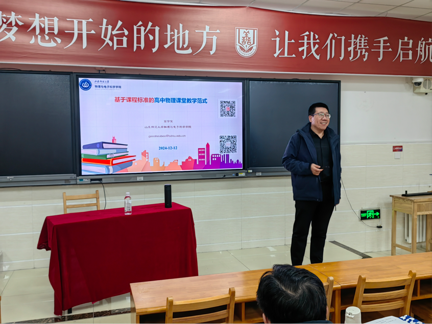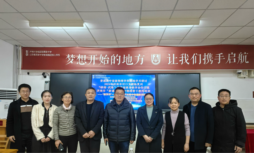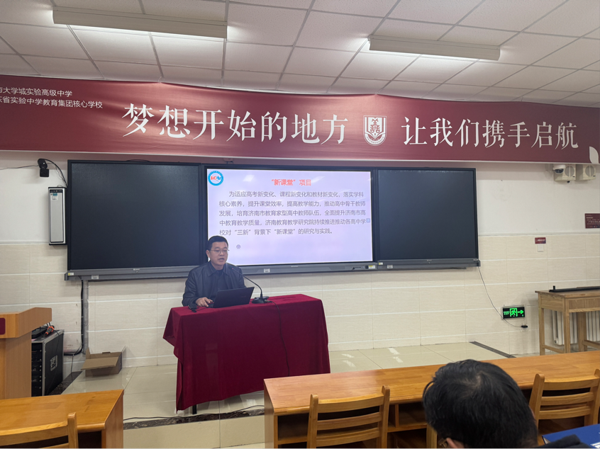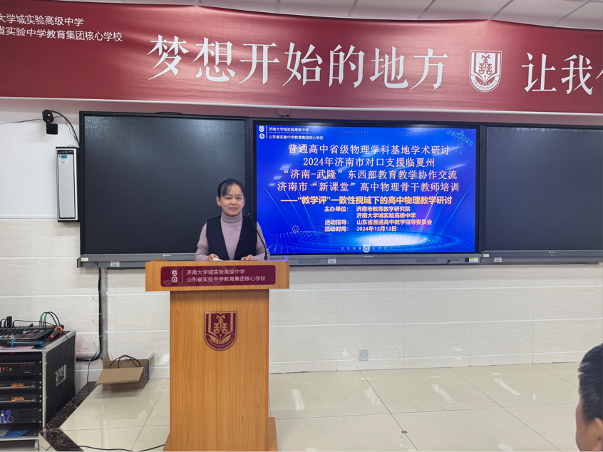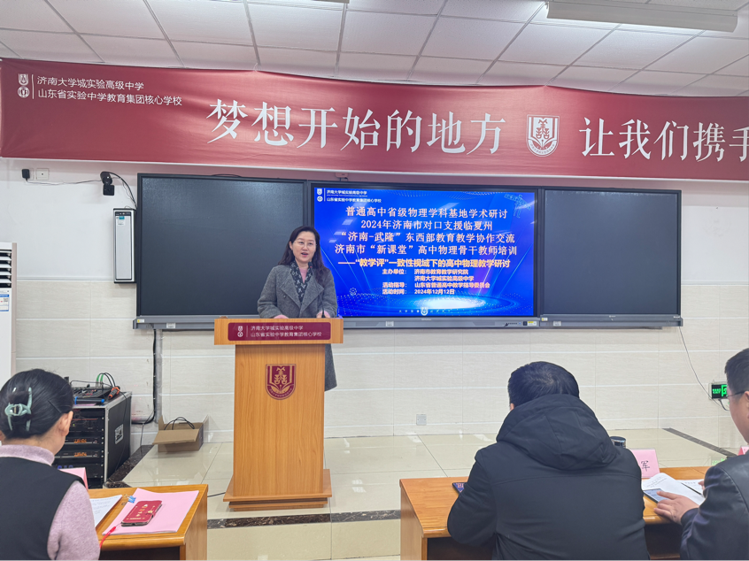 12月12日,济南大学城高级中学举办了普通高中省级物理学科基地学术研讨活动,暨2024年济南市对口支援临夏州、“济南-武隆”东西部教育教学协作交流、济南市“新课堂”高中物理骨干教师培训,本次活动在守正厅举行,曲阜师范大学王焕霞教授、山东师范大学高守宝副教授、济南市物理教研员冯国军、济南大学城校长郑玉香、纪委书记牟忠刚、副校长赵百杰、副校长冯玉、副校长刘威、教科研部主任张继平、教学部副主任赵绪安,以及济南市物理“新课堂”青年骨干教师、济南大学城物理教师出席本次活动,临夏州和武隆物理教师在线观看同步直播,济南大学城实验高级中学教研组长杨伶俐主持本次活动。