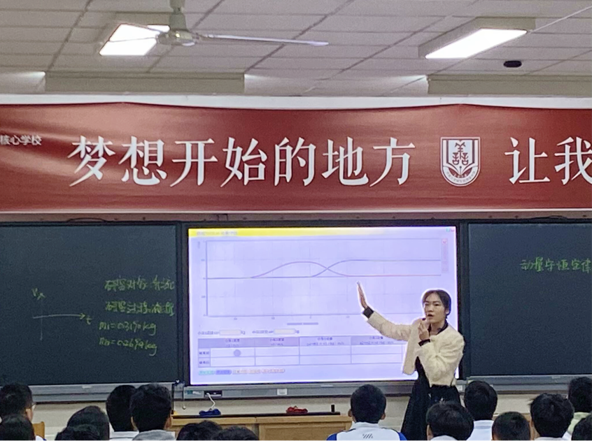 大学城实验高级中学教师赵思莹进行了《动量守恒定律》一节的授课。赵老师以单摆小车的游戏引发学生兴趣,导入新课,借助DIS数字化实验仪器进行演示实验,通过实验实时数据记录,带领学生逐步分析数据,从实验和理论推导两个角度得出动量守恒定律的结论,以问题驱动的方式引发学生深度思考,让学生参与课堂的生成,关注学生科学方法和科学思维的培养,并回扣课前游戏,应用动量守恒定律解释实际问题,最后通过自制冲天炮引入反冲现象与火箭,激发学生的航天梦。
