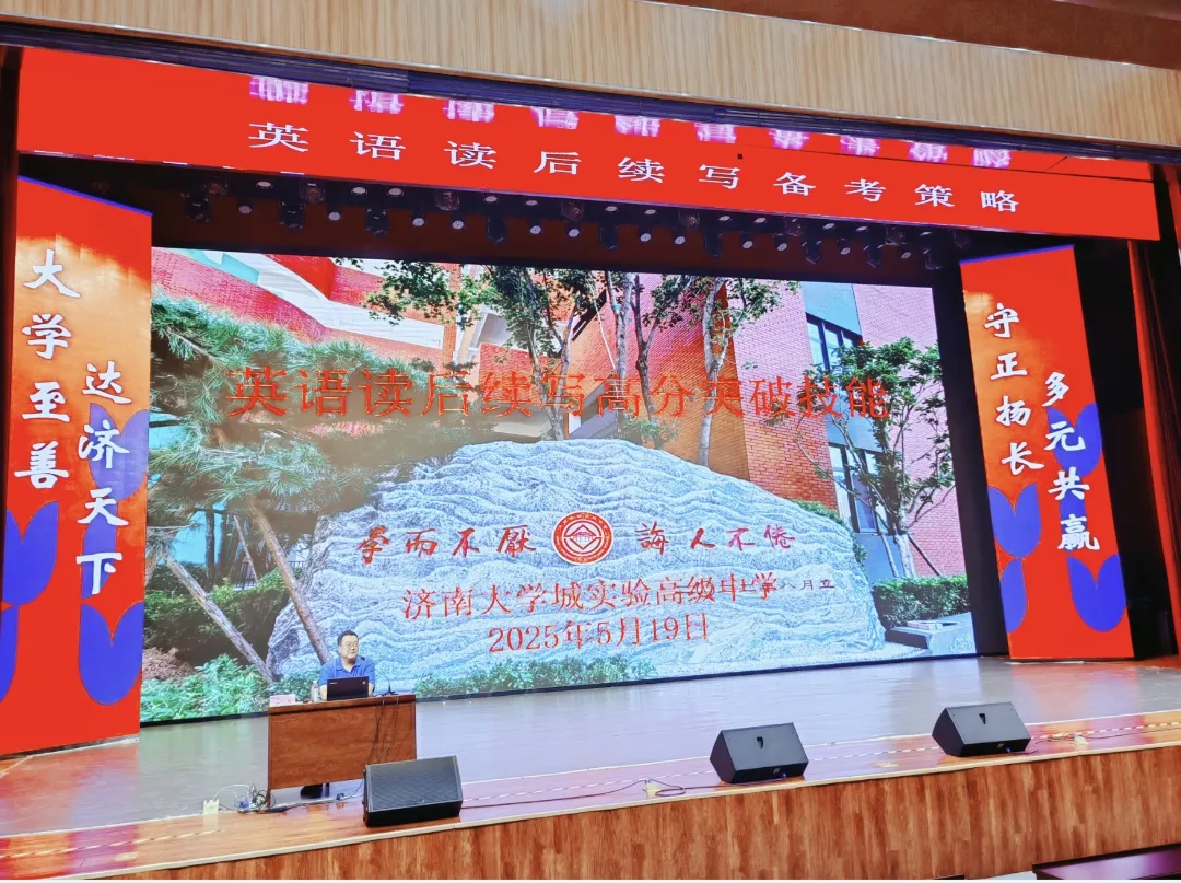 2025年5月19日晚,济南大学城实验高级中学高一、高二学生迎来了一场精彩纷呈、干货满满的学术盛宴——“双高联合项目”英语读后续写高分突破技能讲座。本次活动聚焦高中英语读后续写题型,特邀正高级教师、山东省特级教师、山东师范大学研究生导师乔木老师亲临现场,为学生们带来了一场深度与广度兼具的知识分享。